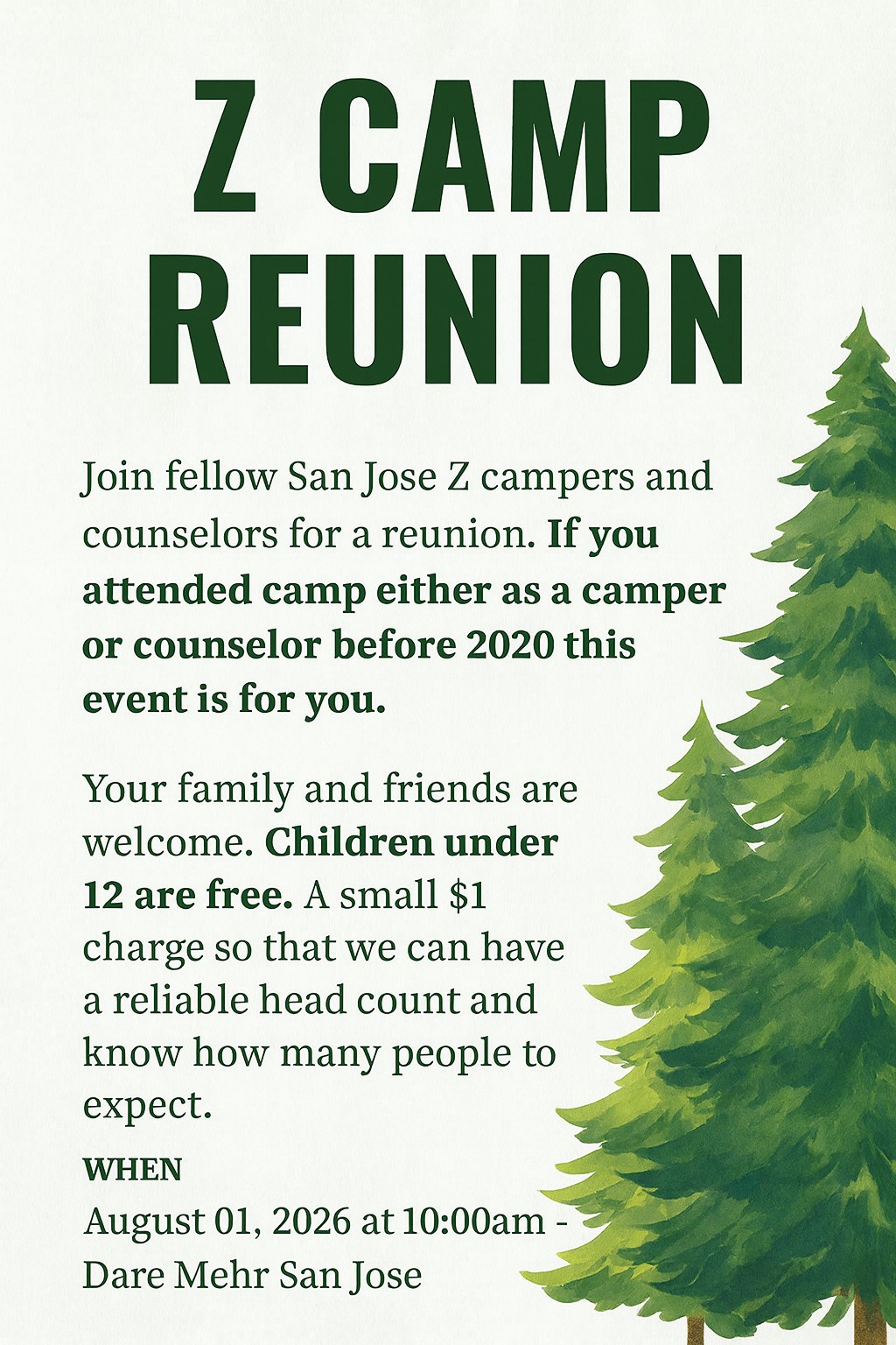 Join fellow San Jose Z campers and counselors for a reunion. If you attended camp either as a camper or counselor- before 2020 this event is for you.